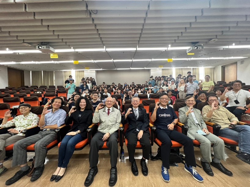 講者與校長、與會老師及全體聽眾合影,前排左起為廣告系陳文玲教授、經濟系徐士勛教授、運動學程主任呂潔如、企管系名譽教授司徒達賢、校長李蔡彥、講者勤美集團董事長林廷芳、副校長詹志禹、教育系副教授鄭同僚。(照片來源:運動學程)