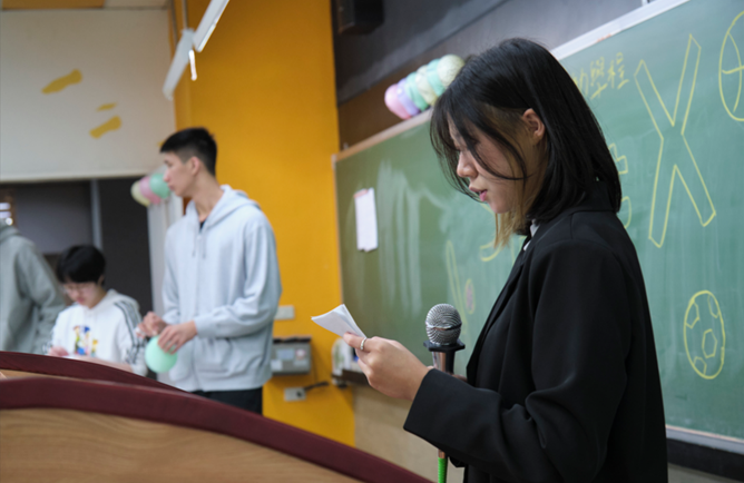 模擬記者會的主持工作也由修課學生新聞系三年級吳妤潔同學擔綱,表現優秀的口條及場控能力。(照片來源:運動學程)